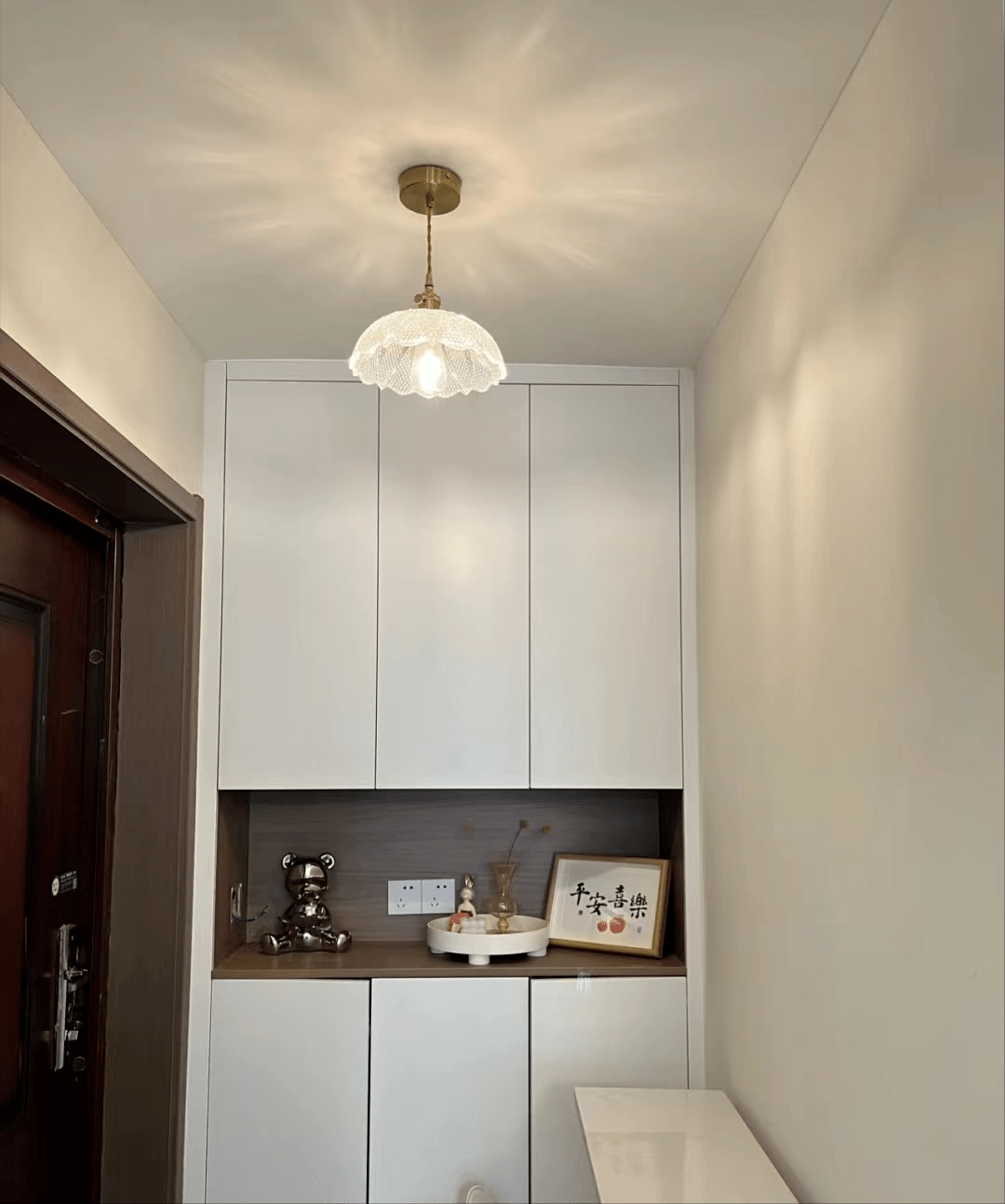 若是要利用较高的玄关灯或者吊灯就要留意了,正在这期间你如果不打开抽屉都不会发觉这个问题。因而必需有一个全体思全体设想。预留空间也会华侈一块。出格是起落衣架升起降下以及晾衣杆拉长的环境。